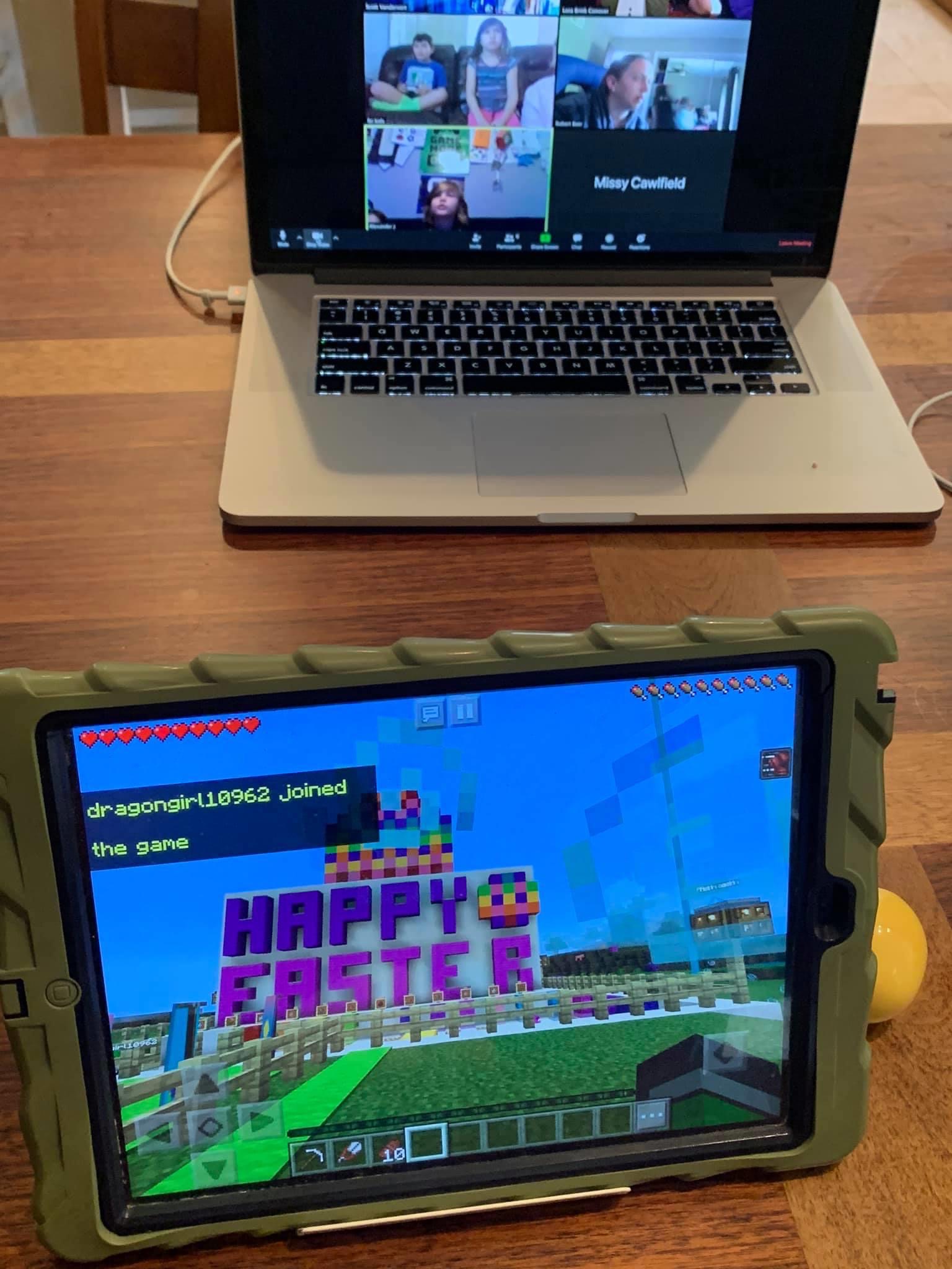 So, during the week leading up to Easter Sunday we created a Minecraft World, populated it with a bunch of colorful “eggs” ( we substituted in-game colored wool blocks ), and scheduled a Zoom teleconference so that the participants could talk.