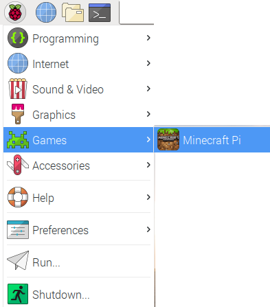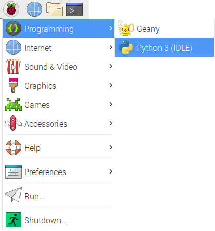 Next we need to start the Python Shell. If you move your mouse you will notice that it is kind of “glued” to Minecraft. If you click the “Tab” button Minecraft will “let go” of it and allow you to do other things. This is called toggling. You will need to toggle the mouse on and off in Minecraft to play with the Python Shell. Go ahead an click the “Tab” button to free up the mouse. This will allow you to Click on the “Raspberry” button at the top-right of your screen. Select “Programming” and “Python 3”.