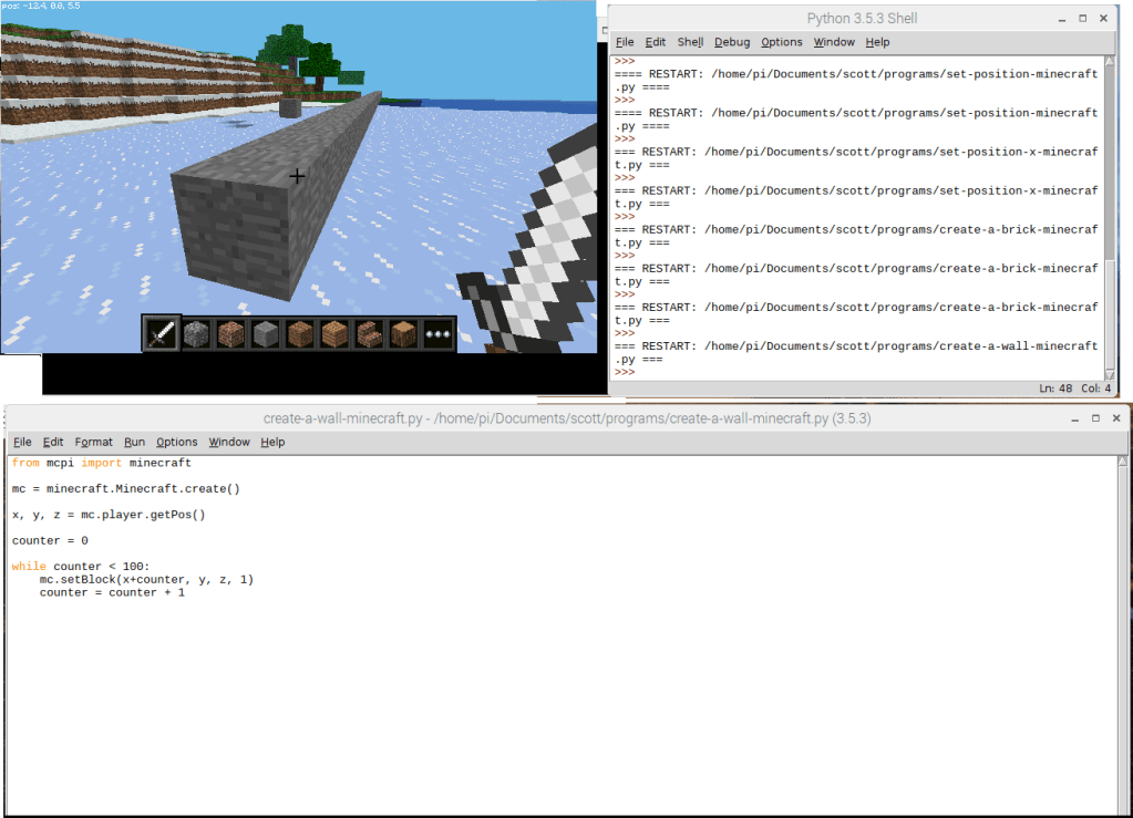 Assuming that you still have the Python Shell and Minecraft Pi running let’s go straight to Step 4 and create a new program.