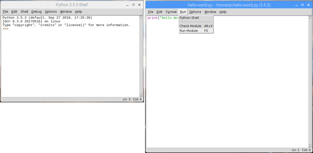 Finally, click “Run” and select “Run Module” in the Text Editor. You should see “Hello World” displayed in Minecraft.